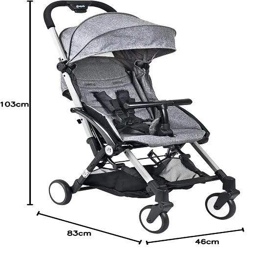 Aberto ele mede 83 cm de altura por 46 cm de largura e 103 cm de comprimento. O espaço interno acomoda super bem a criança sem deixar o passeio apertado.